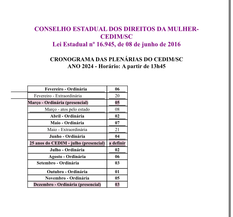 Cronograma das Plenárias do CEDIM SC