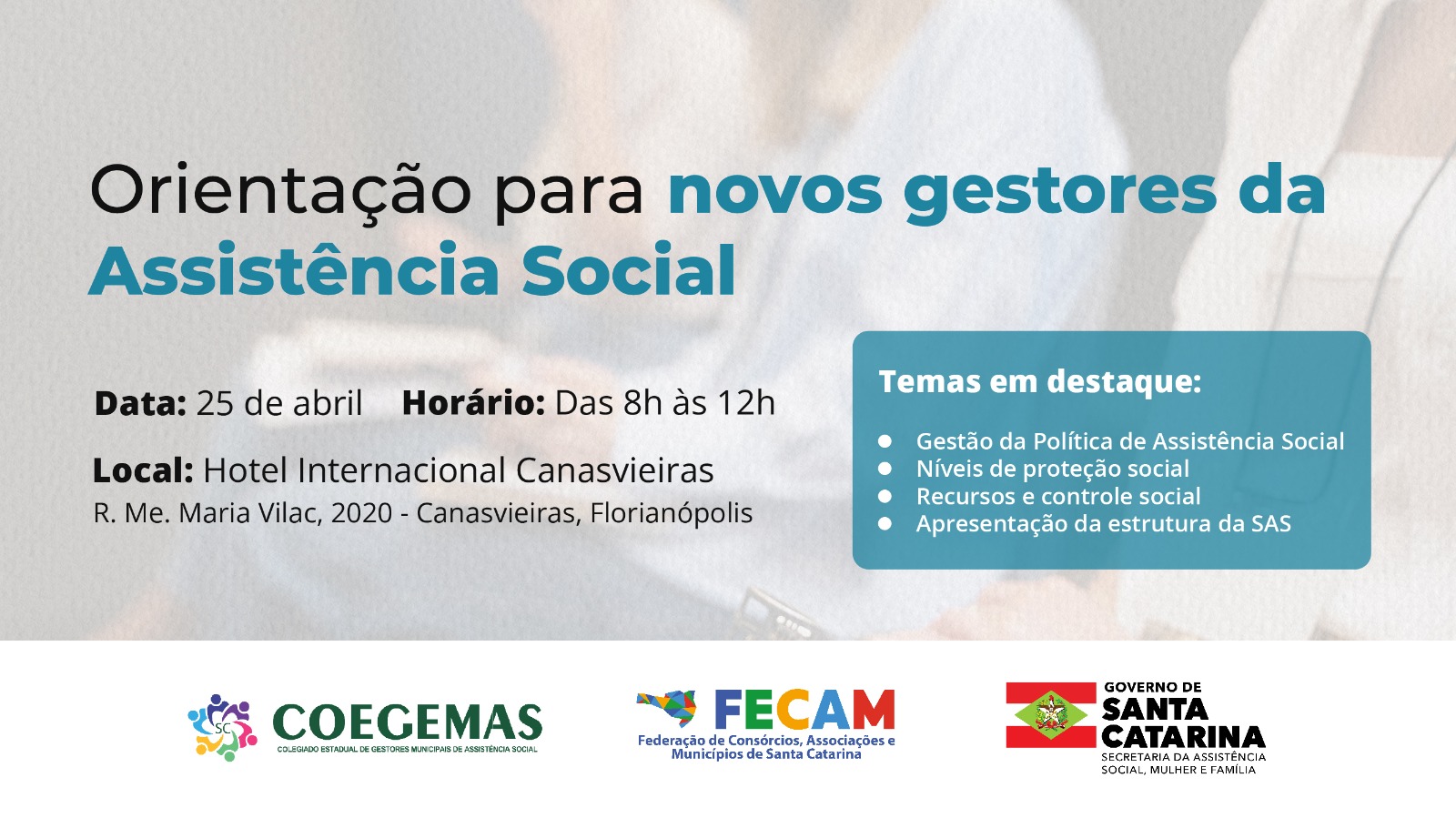 A Secretaria de Estado da Assistência Social, Mulher e Família, em parceria com o Colegiado Estadual de Gestores Municipais de Assistência Social (Coegemas) e com a Federação Catarinense dos Municípios (Fecam), apresenta a Política de Assistência Social de Santa Catarina para os novos gestores da Assistência Social. O evento ocorre no dia 25 de abril no período da manhã, no Hotel Internacional, em Florianópolis.